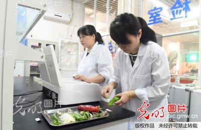 2017年6月28日,食品药品监督管理工作人员在安徽铜陵铜官区幸福村农贸市场“快检室”里,检测市民送检的蔬菜。